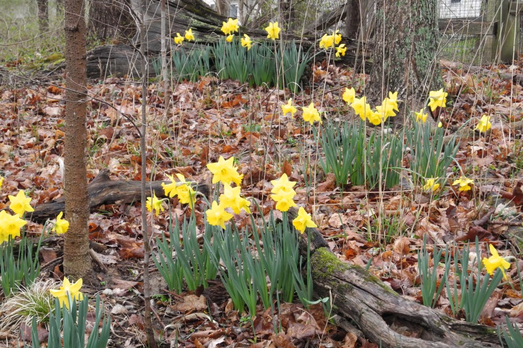 In 2006 when we moved to Siesta Drive was the beginning of a grand love affair dig! On our slice of pie shaped lot, the wooded back hill was just perfect for daffodils bought in bulk at Sam’s Club. Now we have hundreds of blooms each spring. Each fall Bob would lay out where he wanted to plant. At first I would help but in later years he has been the stronger of the two of us. The joy and color in the spring is a testament to his love! Such fragrance and such delight to share and share and still have bunches for our house! Hundreds of King Edward daffodils.