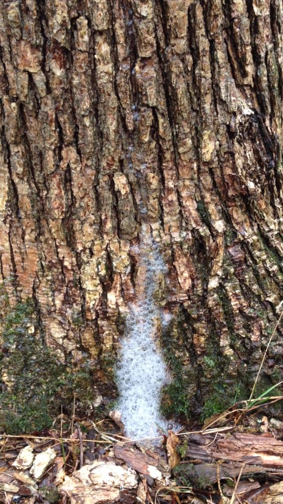 While selecting daffodils I heard flowing water. We do not have a constant stream on our property. Searching for the source of the sound, I looked up and to my surprise the walnut tree had created the steam! Here is a still from that video clip! The streaming water is creating bubbles as it flows. Wish I could send along the sound. Enjoy! Look closely at the top where the trunk appears wet and follow it down.