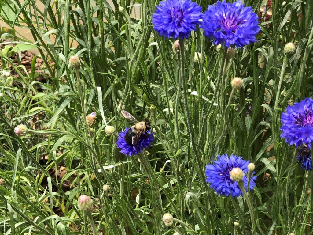 Bachelor Buttons reseeded themselves again and have been gigantic this year of mild weather. In the yard recently I captured a shot of this guy.