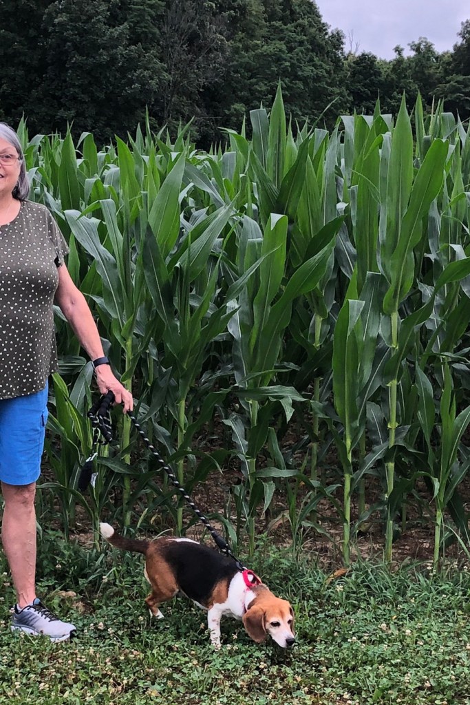 Here she is exploring the edge of a corn field. Mr. Mike wanted to see how tall the corn was here. Sometimes beagles are called “a nose on legs.” She loves to sniff trails where rabbits, deer or coyote’s have traveled. Squirrels are fairly exciting, too!