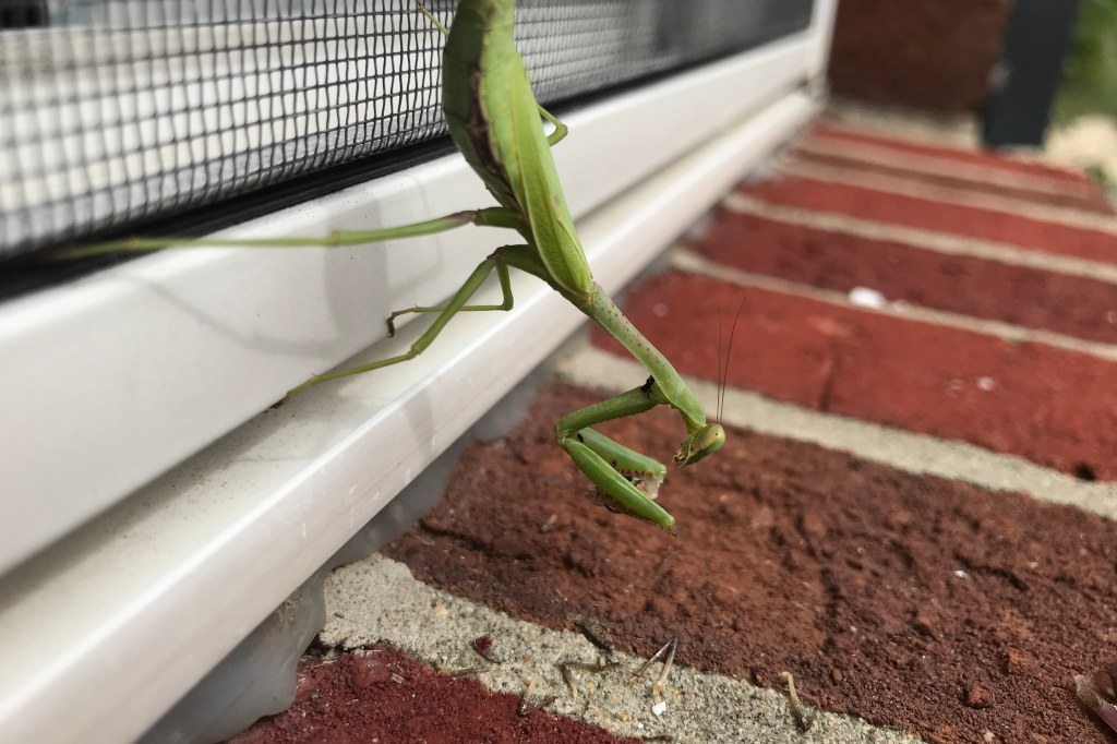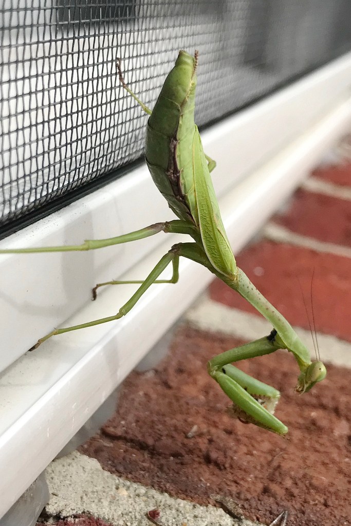 I will not honor the stinkbug beyond the photo on the screen. But that little mantis, when I finally got off the phone she had eaten that thing, shell and all!