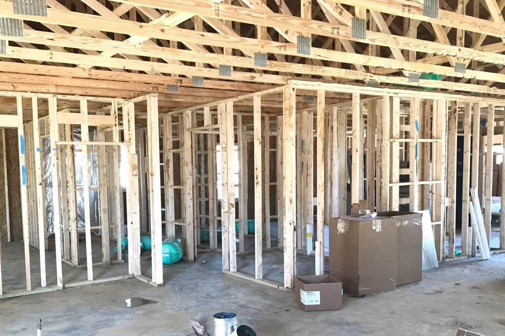 Great room measures 17′ x 16′. So hard to tell dimensions with studs showing!