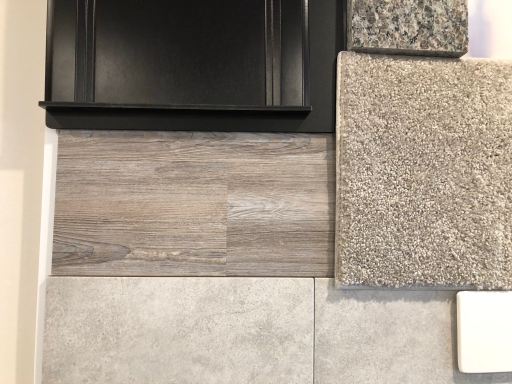We did not want those black cabinets. We chose sort of a cherry finish instead, “Fairfield Nutmeg.” To the right of the black cabinet is our countertop sample. Carpet sample will be in bedrooms and office. Tile will be flooring in bathrooms and laundry floor. Above the tile is sample of the resilient flooring that will be from front door, throughout great room, dining room and kitchen. I think it goes down the hall to laundry and master bedroom, too.