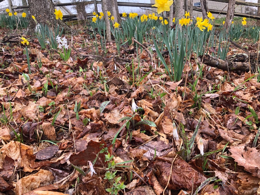 Daffodils in the front garden with tuned chimes. Narcissus in the side garden on land we do not own, but no one cares that we have planted there! This also the milkweed bed later in the year.