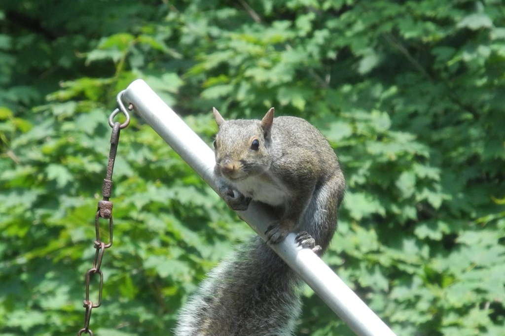 At our house on Siesta Drive he would occasionally get one. We installed a spring on the bird feeder that was hanging over the edge of the deck (with a twenty foot drop to the ground). That squirrel was so confused and frustrated that he could not feed upside down and gorge himself on bird seed.