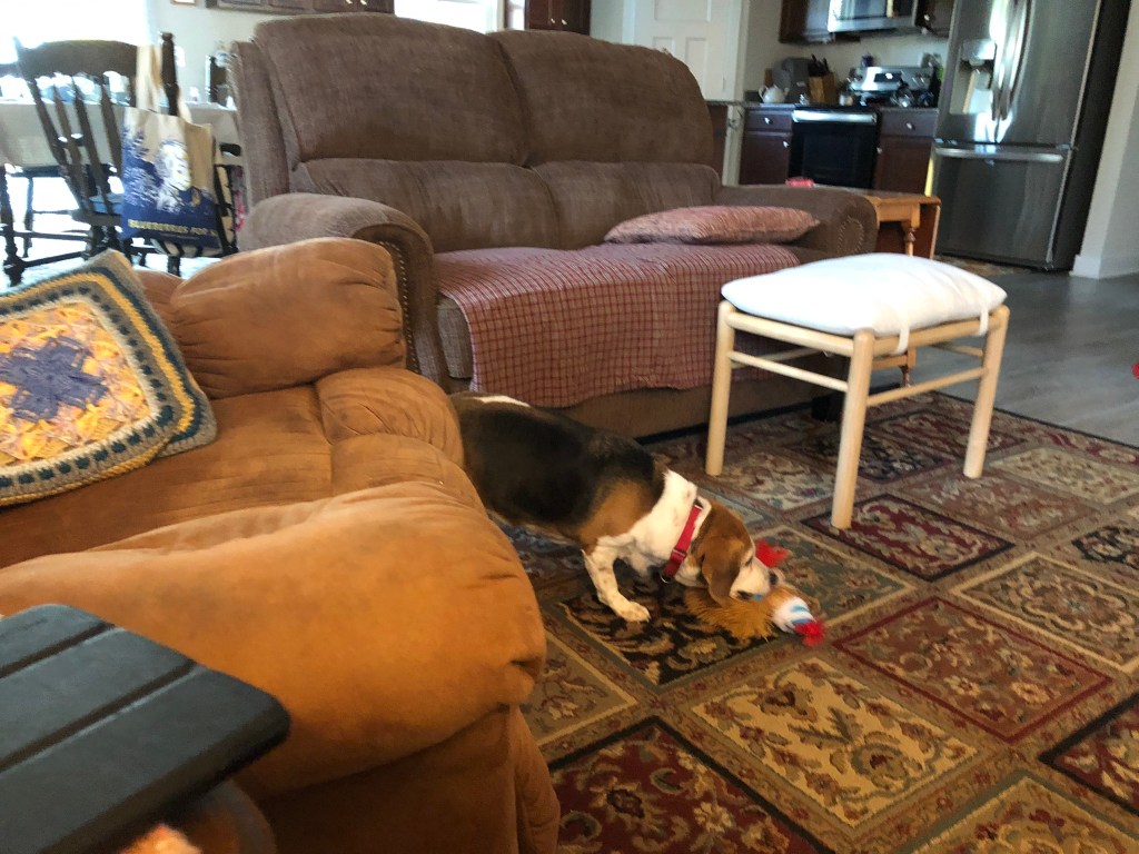 Next she put her claws on its foot and dragged it to the loveseat with her. Before I knew it she knocked it the floor and began chewing. Bob was working at his computer in the office. I texted him to come see.