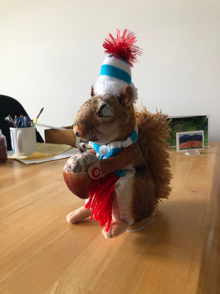 Before we knew it she carried the squirrel off to where he was working in the office. I told him we had to be careful she doesn’t try to eat it, wires, batteries, fringe on scarf, fake fur, etc.