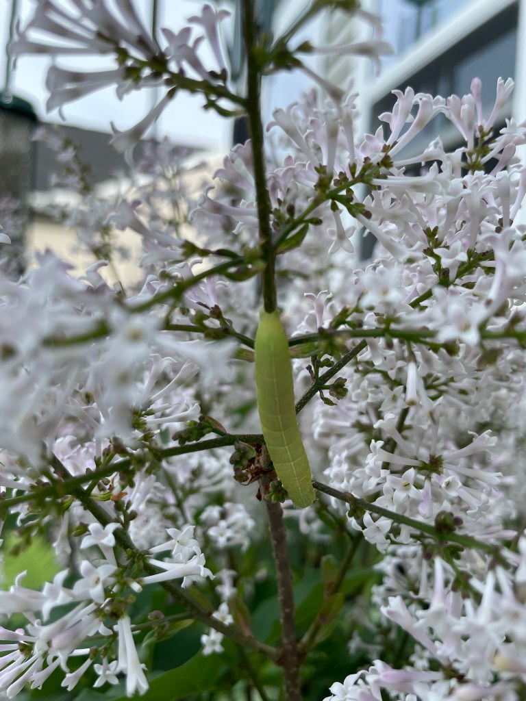 The lilac bush out front (that was supposed to be a Vitex, more like a butterfly bush) looked unusual at first glance. Then I realized the stem was wider because of the caterpillar on in! See the black arrow below.