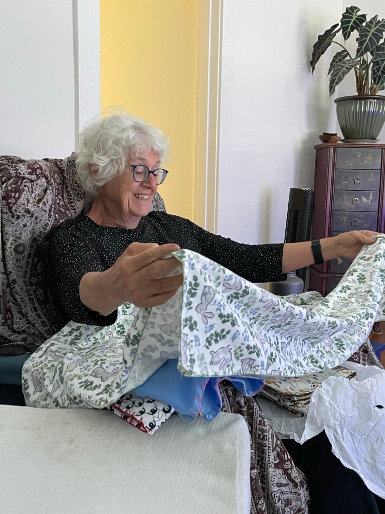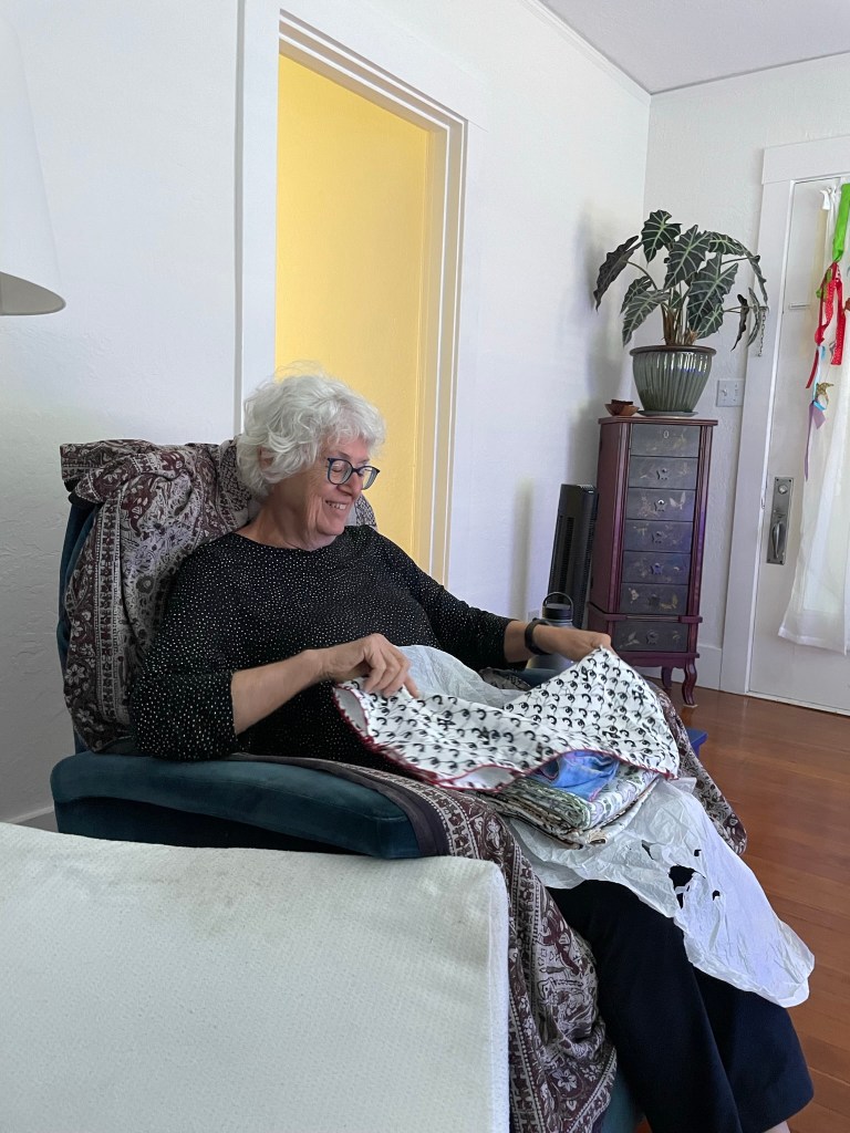 Here is Karen upon seeing receiving blankets for her next grandchild, red stitches on edge are crocheted.