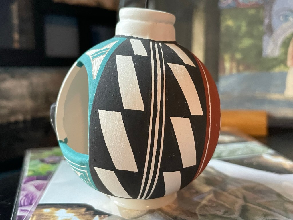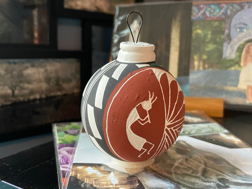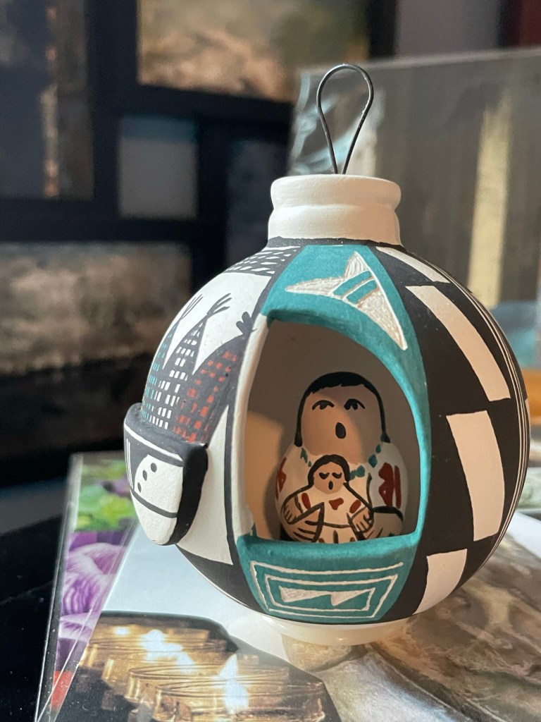 When we visited Acoma Pueblo with our friends, Dan and Betty Cooksey, we purchased an ornament with a ‘Storyteller’ or ‘Singing mother” inside with her child. I like to think of it as Mary rejoicing to God the Father as she holds Jesus the Son. I do not place it on our tree for fear it will get broken. It sits on the top of the china cabinet with the Nativity scene during the Christmas season and inside the lighted china cabinet the remainder of the year.