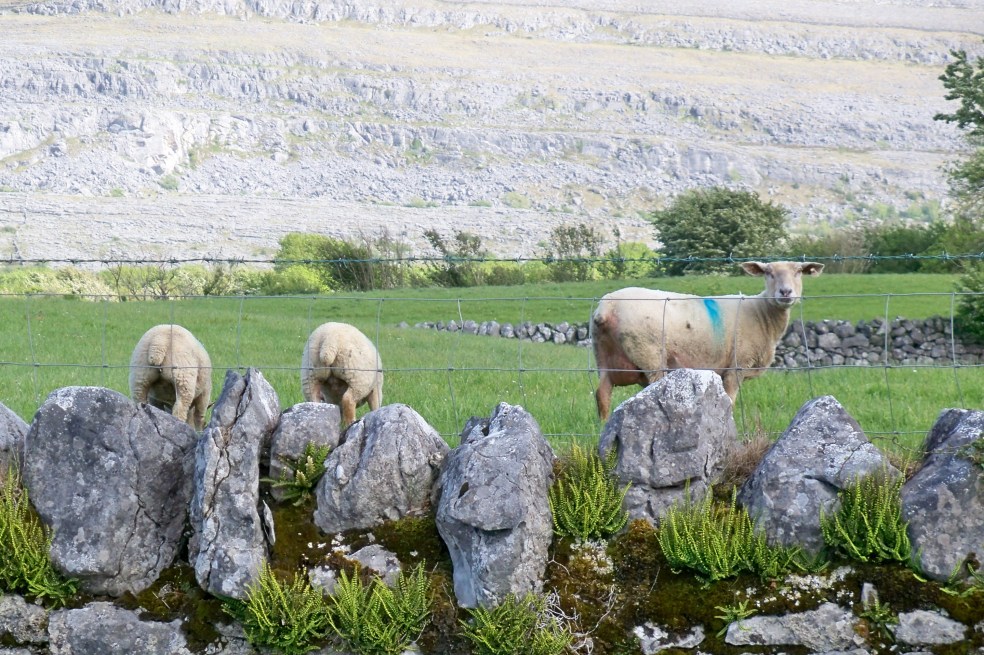 Cracked me up! Guess those sheep were sneaking around and on a mission – not to get caught! The Irish mark their sheep with paint, thus the pink and blue marks on the wool!