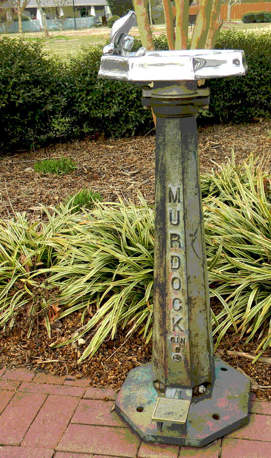 Growing up we had drinking fountains like this in all the city parks and on the playground at school. Water never tasted as good as on a hot day when it gurgled up from below ground (I could hear it arriving) and splashed up to my mouth, into the dish, down the overflow drain. There are many modern versions of this from the same company, Murdock.