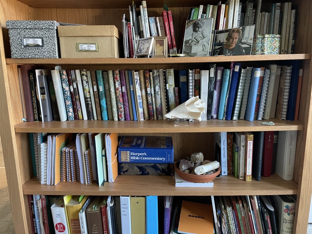 The shelf with the open shell and the shelf below it up to the Bible and Harper’s Bible Commentary show my journals minus one or two.