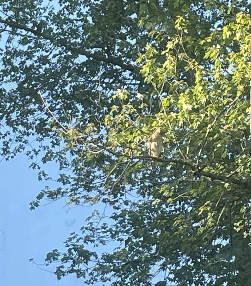 Later I did my morning challenging walk. As I returned down a street near us there was a red-shouldered hawk sitting atop someone’s garage. As I watched another red-shouldered hawk flew right past it into the tree line.