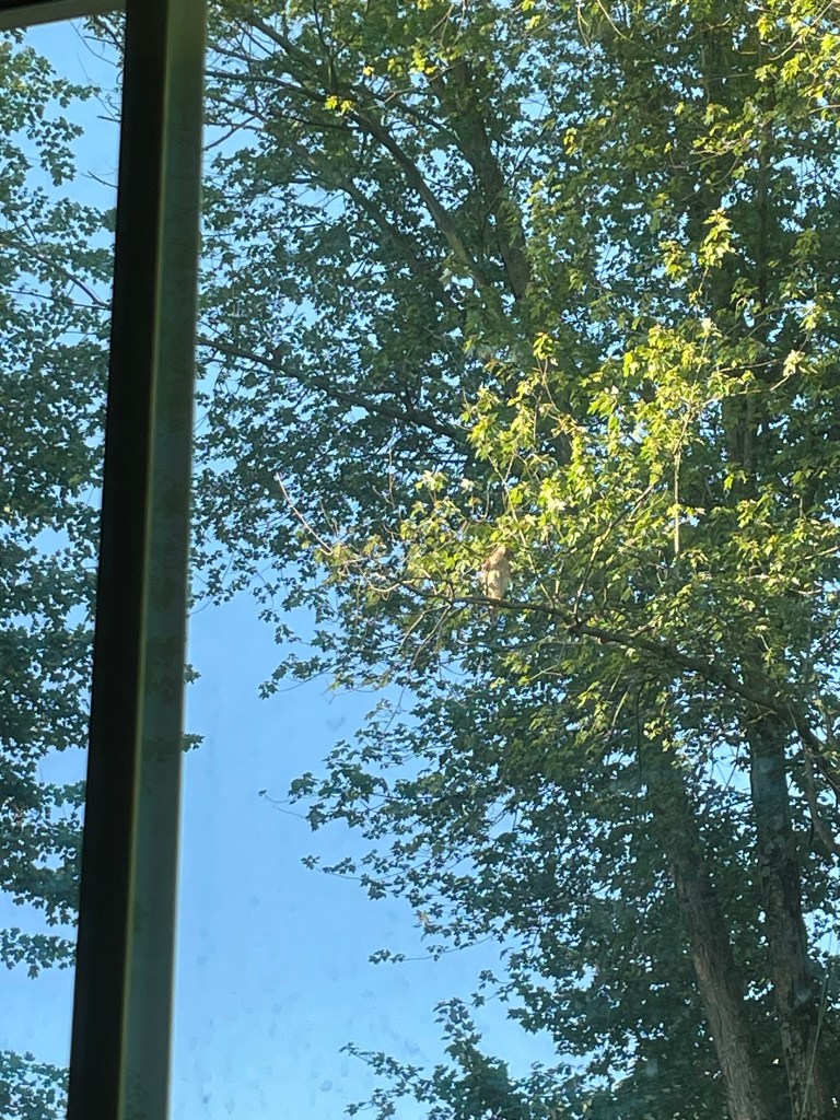 There is a red-shouldered hawk who inhabits our neighborhood. Some days I hear it screaming high above the earth as it flies in the sunlit sky. Sometimes it blasts like a rocket silently between the houses and the hedgerows. This morning I was hearing it. The Merlin app identified it for certain by its call. Then most surprisingly as I was trying to formulate words around a quote, unbelievably, the same hawk was perched on a sunlit branch right outside my window, looking at me in my prayer chair, the sun at times reflecting on its black, shiny eye. I was stunned. The smaller birds were going nuts trying to send out alarm calls to their brethren. I sat shocked into stillness and blessed.