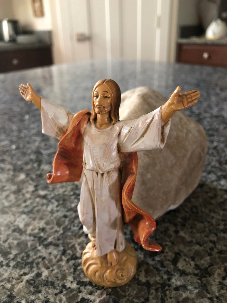 I saw a similar image in prayer one Lenten season. Then I spotted this little statue in a bookshop. On my kitchen countertop, Christ stands before a stone that represents the one in front of His grave. He is risen indeed.