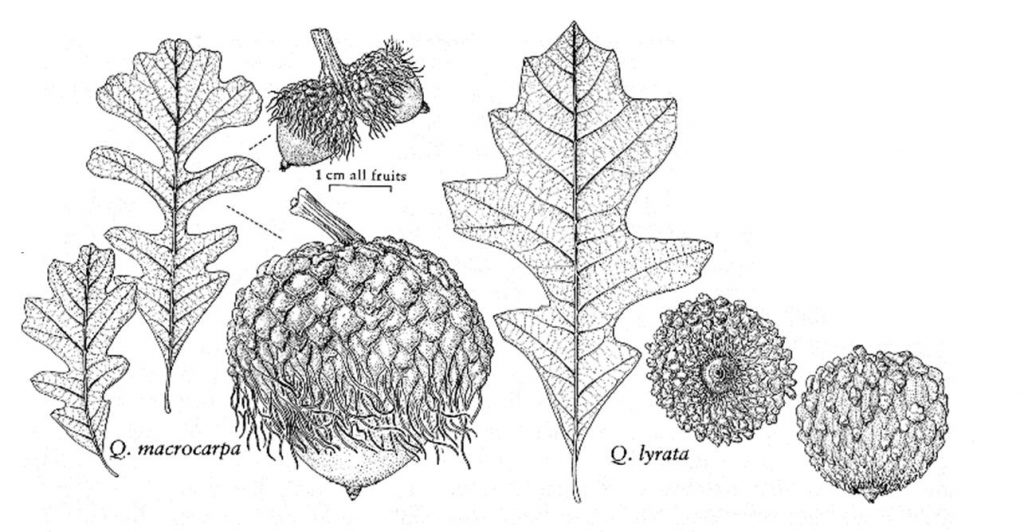 The acorn itself is classified as a nut, because of its bony pericarp, and is actually the fruit of the oak tree. Particular to the genus Quercus, the stem broadens to the cupule or cap that holds the oak seed and fruit in place. The burr oak, so named because of its characteristic large seeds or acorns, was known as u’tahu can in the Native American tongue of the Lakota people, meaning acorn stem tree. More than half of the one-inch acorn is enclosed in a fringed, spiny cupule. Native Americans used them as an important dietary item with great storage capability and mobility. Wildlife, including turkeys, blue jays, squirrels, and deer also utilize acorns as a food source that is rich in carbohydrates and fats.