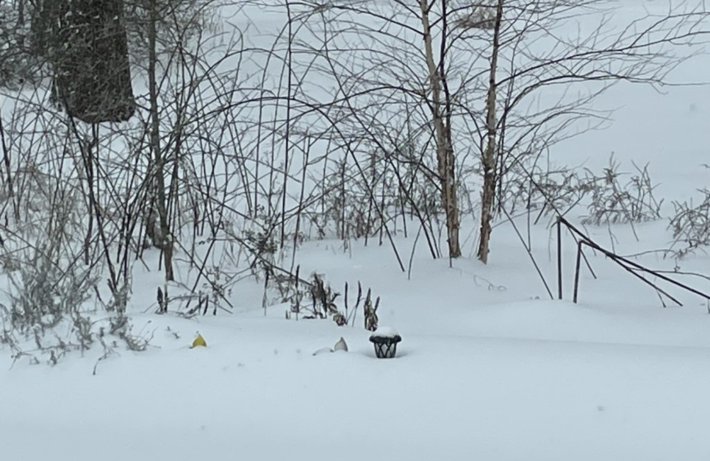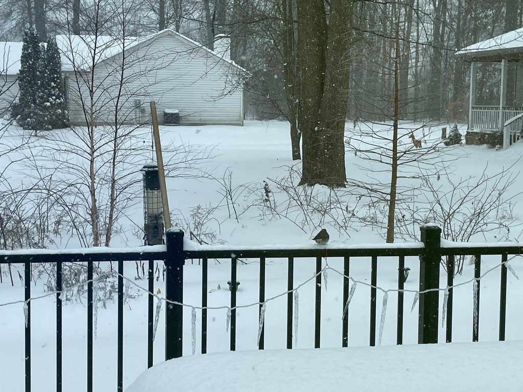 Have not seen a squirrel or a white-tailed deer today. Guess they are hunkered down and trying to stay warm? Local weather says “Snow continuing. Additional snow accumulations up to three inches. Winds gusting as high as 35 mph.”