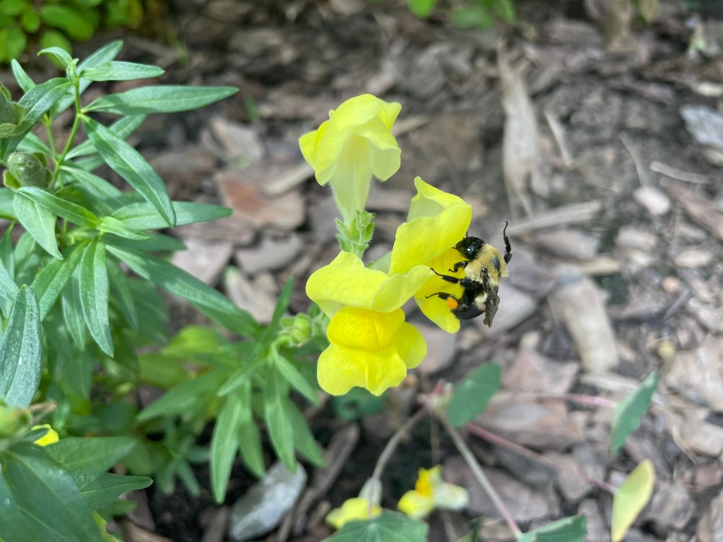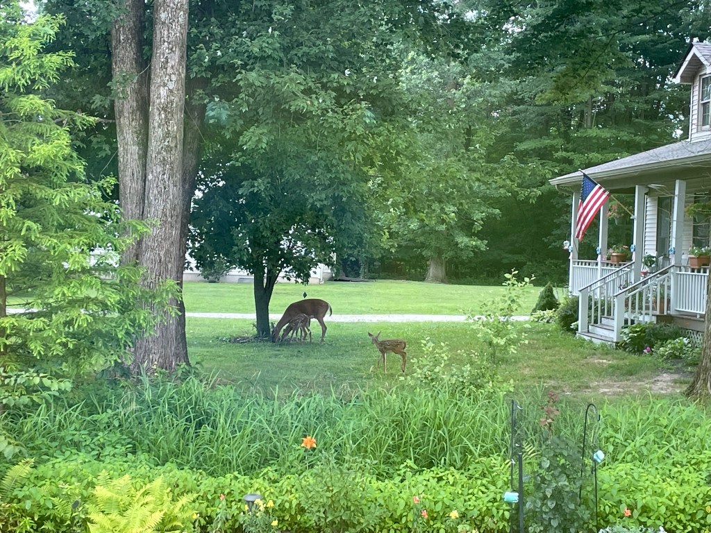 It was such bright orange I was not even certain it was a box turtle at first. This really was a wonder! So much so that I went on the back deck in my summer pajamas to try to capture a photo for Bob. (He was out mailing my letter and walking the beagle.) Needless to say the photo was not much more than proof that it appeared in the yard. It seemed to be headed for the pile of seed shells and dropped seeds under the bird feeder. My presence made the turtle uneasy and it scurried back into the vegetation.