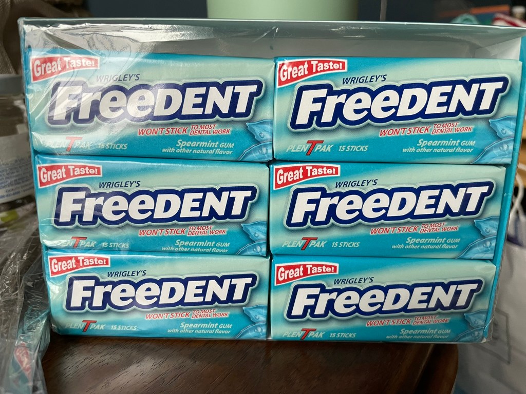 And to my delight I also got the 12-fifteen-stick packs of Freedent chewing gum. The local stores stopped carrying it. Makes no sense to me! More and more of us are wearing dentures and partials. This is the one gum that does not stick to those appliances. So why discontinue it? The only place I have been able to find it is Amazon. (Sorry, Lisa.)