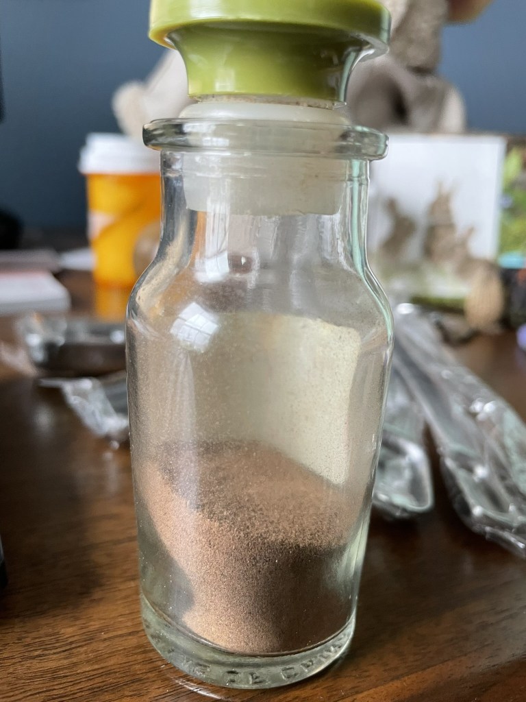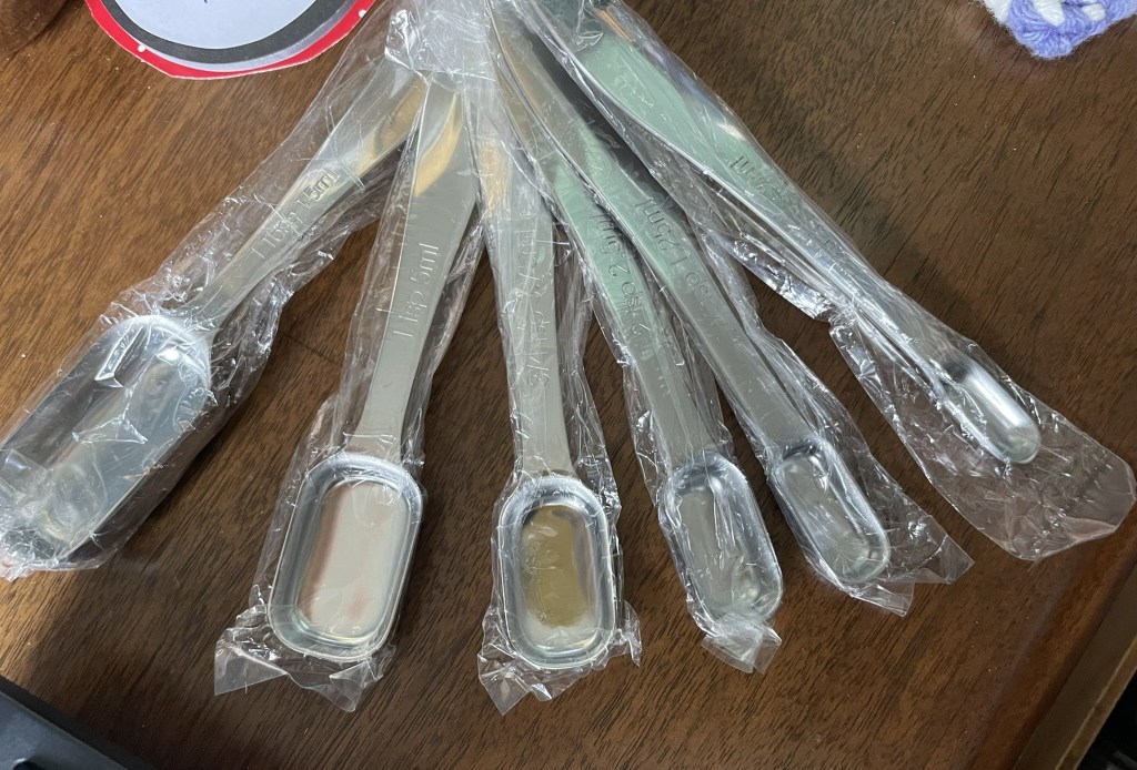 When we were making cookies Bob mentioned how some of my spice jars are too small to get the measuring spoons into. He said we should get different jars. These particular jars are from our first year of marriage and I love them for just that reason! I also keep spices in there that I do not use very often such as ground cloves, allspice, etc. So on Amazon I found measuring spoons that have rectangular measuring areas. And I received them as a gift. I just went and tried them out.