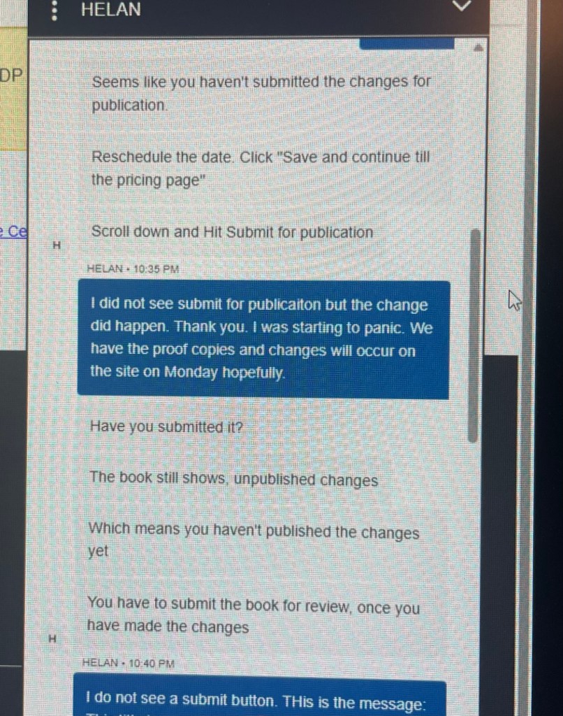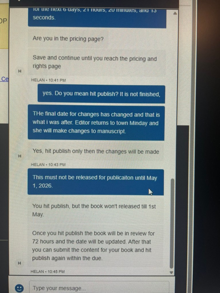 Helan assured me I could change the date. Then I had to submit the change, keep approving until I got to pricing page and then hit Publish. I really froze up then. IT IS NOT READY. She basically said trust me. I did what she said. The Kindle Direct machine then said it would review my manuscript and that could take up to 72 hours. Until then the account would lock. I took screen shots of the texts. I wanted proof if this thing got printed without the final edits.