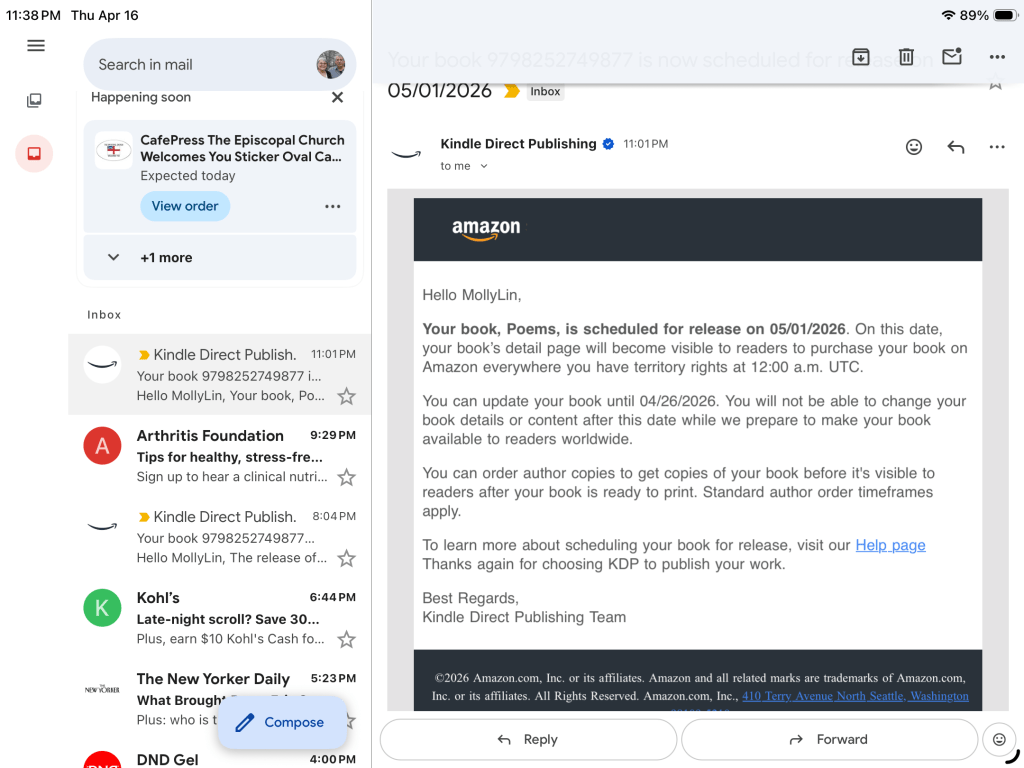 So my friends, the new book ought to be available to you on May 1, 2026 through Amazon. (I already found an error in the Table of Contents. Will be amazed if that is the ONLY error!) If you can’t find the title Poems, just type in my name. That ought to bring it up!