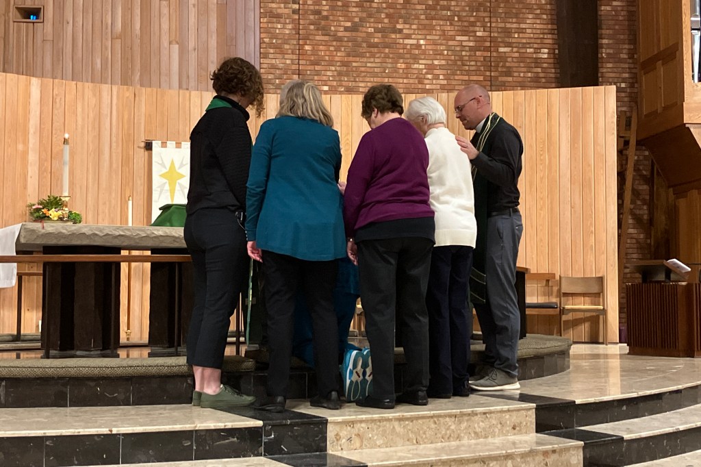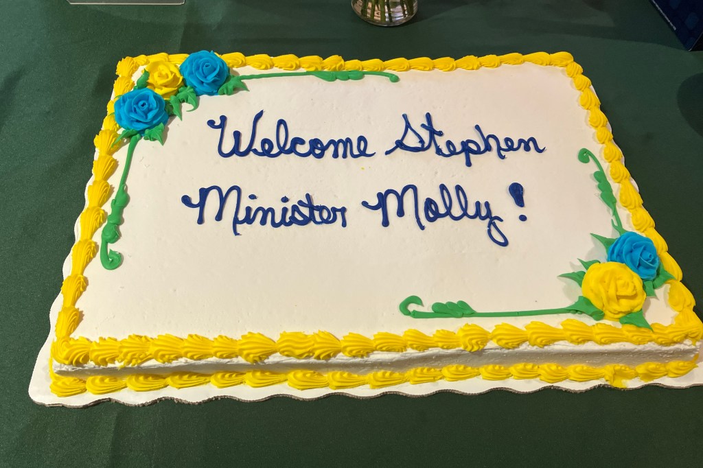 So stand me up in front of the congregation, say a prayer over me, applaud .. NOT my cup of tea. Yet to be commissioned as a Stephen Minister I had to do just that. Our three priests and leader of Stephen Ministry and two other Stephen Ministers prayed over me as I knelt. Then there was a reception with cake and congratulations and it was all just difficult for me. The only easy thing was agreeing to serve the Lord through Stephen Ministry.