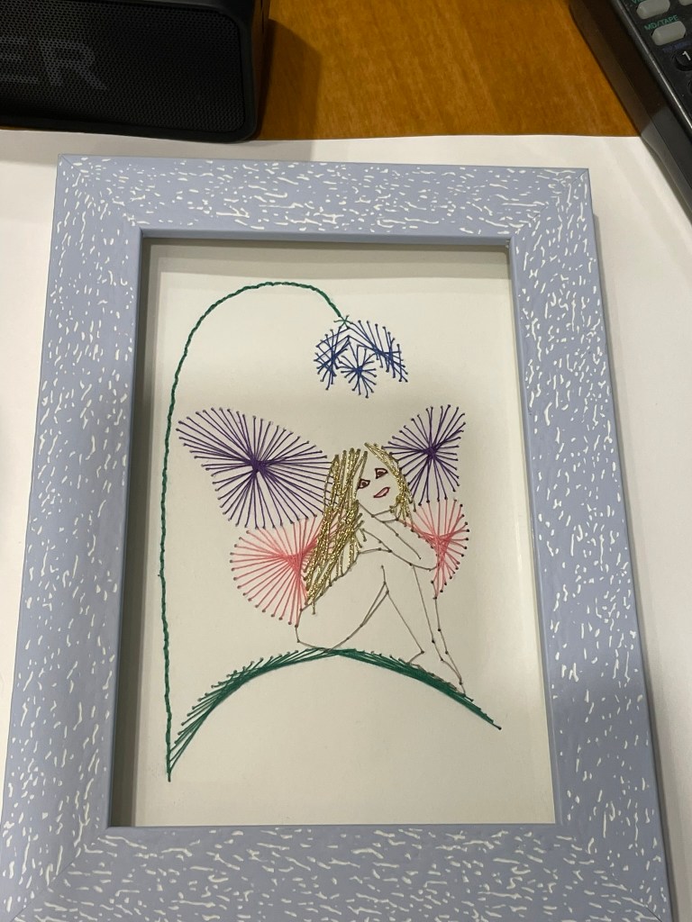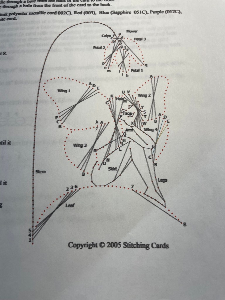 Last summer Sister Corina taught the Journey Together in Stitches group how to do card stitching. I made intertwined hearts for a card for Bob. Then I researched other patterns on line. I found one that spoke to me of our son’s wife. It is a fairy sitting under a flower with 4 wings and golden hair. This pattern was one of the hardest things I have ever made. I almost gave up and threw it away several times. In the beginning I had to start completely over as the lower area did not look right. Then finally last week I was down to wire. Either finish it or pitch it. I got it finished. Here is part of the difficulty.