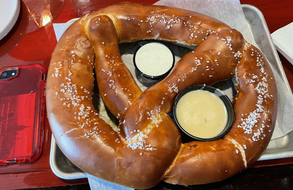 The pretzel comes with a little cup of Queso cheese and a little cup of ranch dressing. Now they no longer reduce the price on the pretzel. (They were likely losing money on it!) In fact when we returned recently we had decided to make the jumbo pretzel our dinner. We ate much of it, but carried 2/3s of it home.