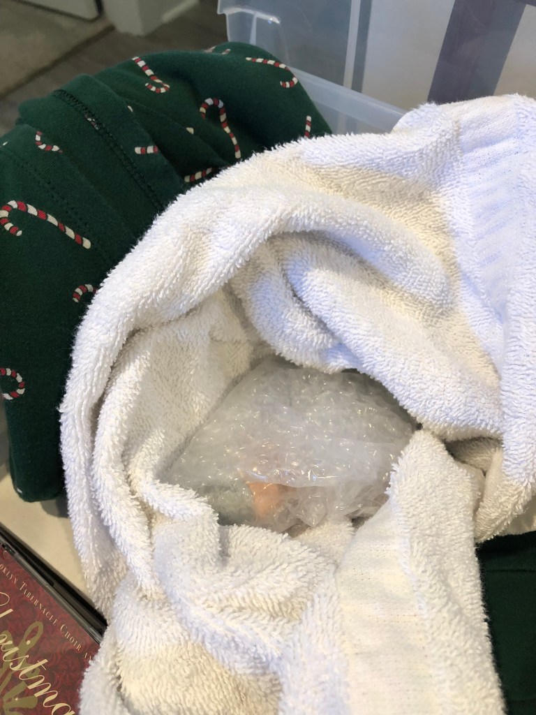 As soon as we placed the box in the car after we retrieved it from storage cube, I flipped this box open and there he was! Inside the candy cane turtle neck, cushioned in a towel! Yes, my instinct was correct. I had placed him in a Christmas box when moving. It had space and padding to keep him safe.